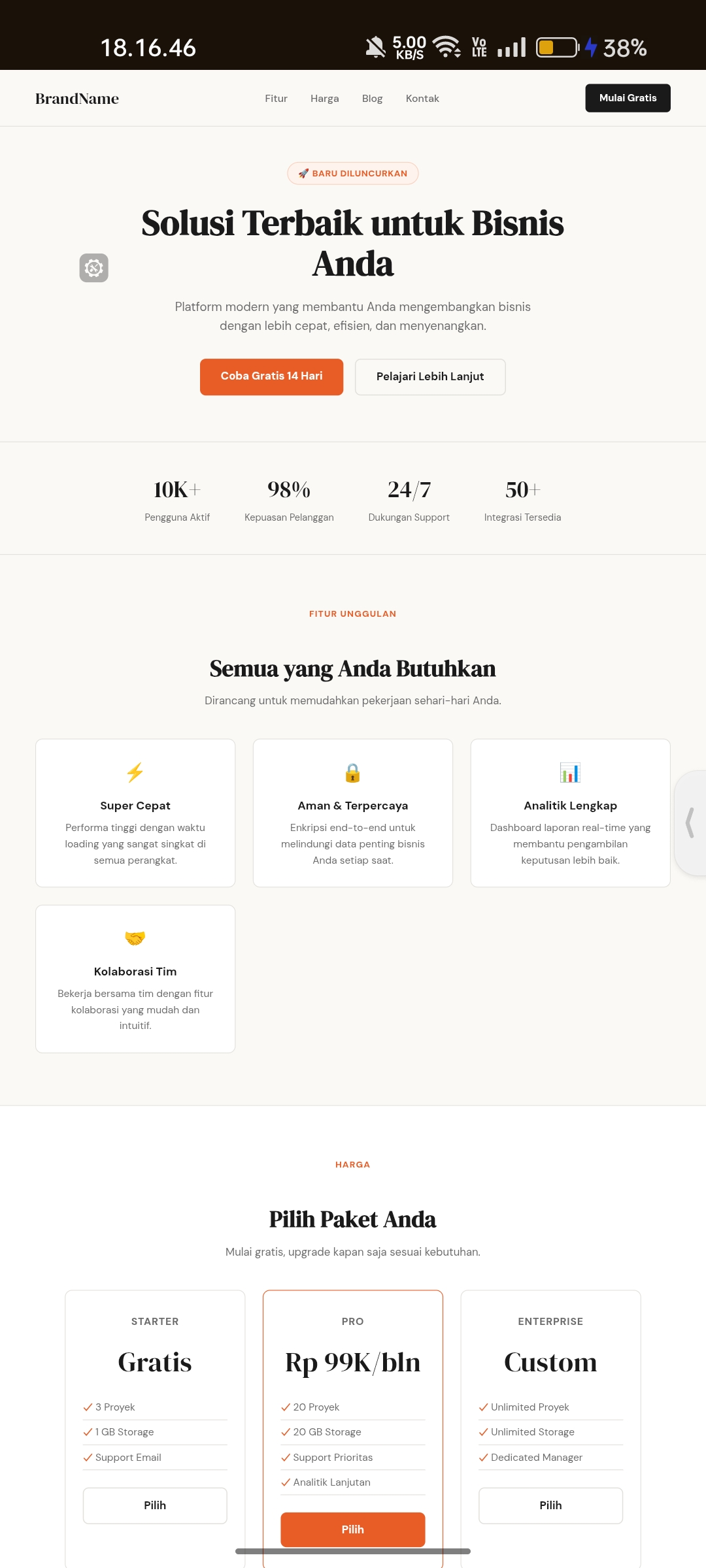 Template landing page modern lengkap dengan hero, fitur, harga, blog & form kontak. Cocok untuk bisnis apapun.